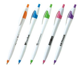 The Javalina Colors Available: Lime Green, Orange, Pink, Purple, Sky Blue Trim with White Barrels. Maximum imprint area: 1 1/2" x 3/4". One time screen charge of: $10.00. Standard production time is five days. Plus Ship TimeRush Service Availible!Blue or black ink cartridges available. Blue writing ink default unless otherwise stated