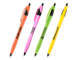 The Javalina Colors Available: Green, Orange, Pink and Yellow with Black Trim. Maximum imprint area: 1 1/2 " x 3/4". One time screen charge of: $10.00. Standard production time is five days. Plus Ship Time Rush Service Availible! Blue or black ink cartridges available.  Blue writing ink default unless otherwise stated